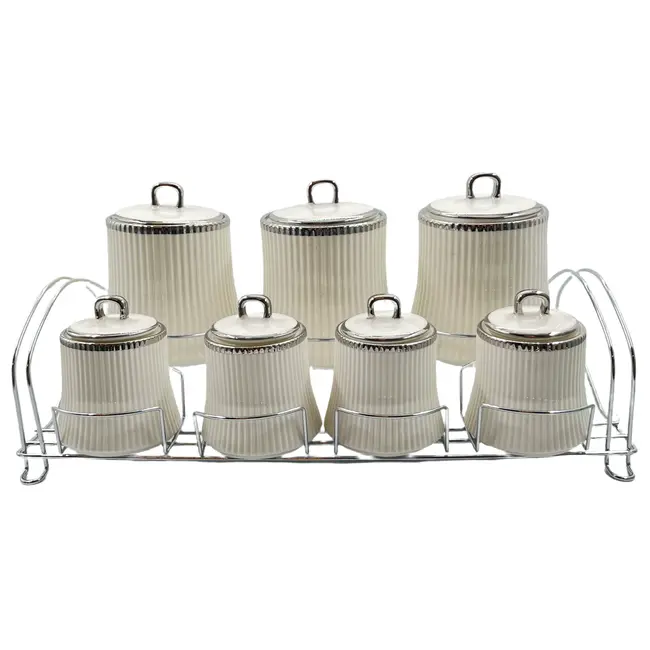 Breng stijl en elegantie in je keuken met deze prachtige Almina voorraadpotten set. De set bestaat uit 6 porseleinen potten in verschillende formaten, gepresenteerd in een metalen houder met een sierlijke afwerking in zilver of goud. Elke pot is zorgvuldig vervaardigd uit hoogwaardig porselein en voorzien van een glanzende deksel met bijpassende ringgreep. De combinatie van een verfijnde glans en strakke lijnen geeft je aanrecht een luxe en georganiseerde uitstraling. Of je nu koffie, thee, suiker, rijst of kruiden wilt bewaren – deze set biedt zowel functionaliteit als een stijlvolle uitstraling voor elke keuken.