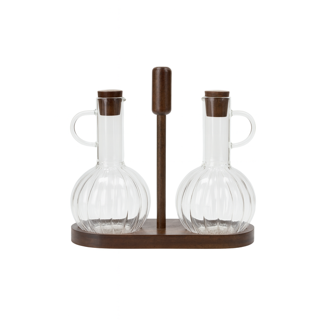 Breng stijl en functionaliteit samen met de Almina Luana Con Due olieflessen. Deze set bestaat uit twee glazen flessen van 350 ml, gepresenteerd in een elegante acaciahouten houder. Dankzij het subtiele ribbelglas en de natuurlijke houten accenten is dit zowel een praktisch keukenaccessoire als een blikvanger op tafel. Ideaal voor olijfolie, azijn of andere smaakmakers.