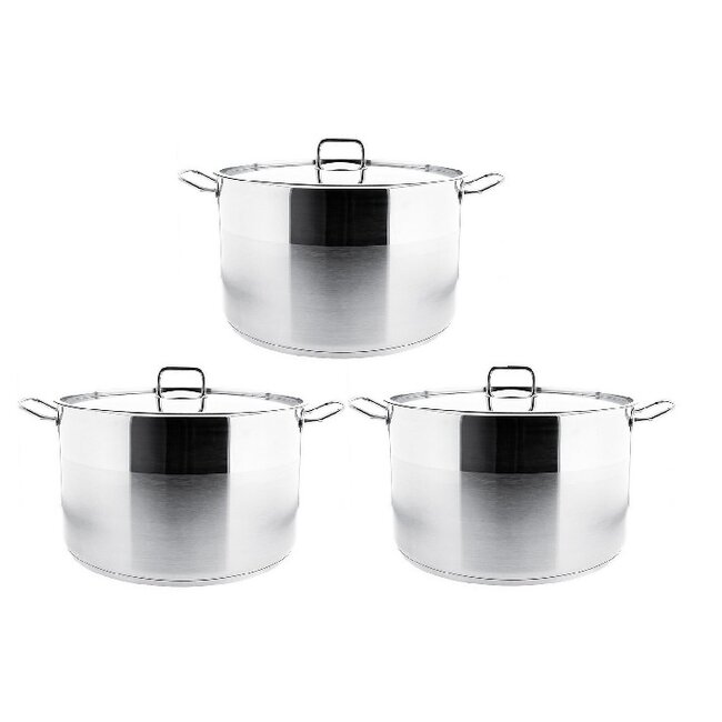 De Almina Vitalia kookpannenset bestaat uit drie hoogwaardige roestvrijstalen kookpannen met deksels, ideaal voor grootschalig koken. Met capaciteiten van 18L, 21L en 25L heb je altijd de juiste pan bij de hand – van middelgrote maaltijden tot uitgebreide gerechten voor grote gezelschappen. De duurzame constructie en het elegante zilveren design zorgen voor topprestaties en een professionele uitstraling in elke keuken.
