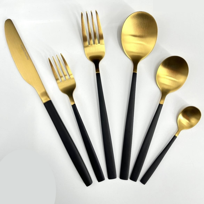 Voeg een vleugje elegantie toe aan je eettafel met de Almina Isabella bestekset. Deze 36-delige set, geschikt voor 6 personen, is vervaardigd uit hoogwaardig 18/10 roestvrij staal en afgewerkt met een verfijnde matte gouden coating. Het tijdloze ontwerp, gecombineerd met het stijlvolle zwarte handvat, maakt deze set ideaal voor dagelijks gebruik én feestelijke gelegenheden.