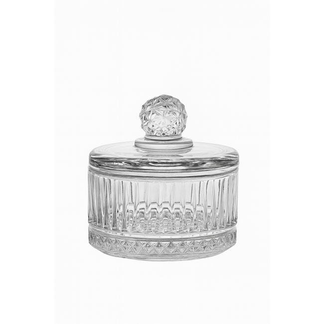 Bewaar je snoepjes, suiker, noten of kleine lekkernijen in stijl met de Almina Elisa glazen kom met deksel. Deze elegante kom heeft een luxe geslepen design met een decoratieve knop op het deksel. Het heldere glas laat de inhoud mooi zien en maakt deze schaal ideaal als praktische opberger én decoratief element in huis.