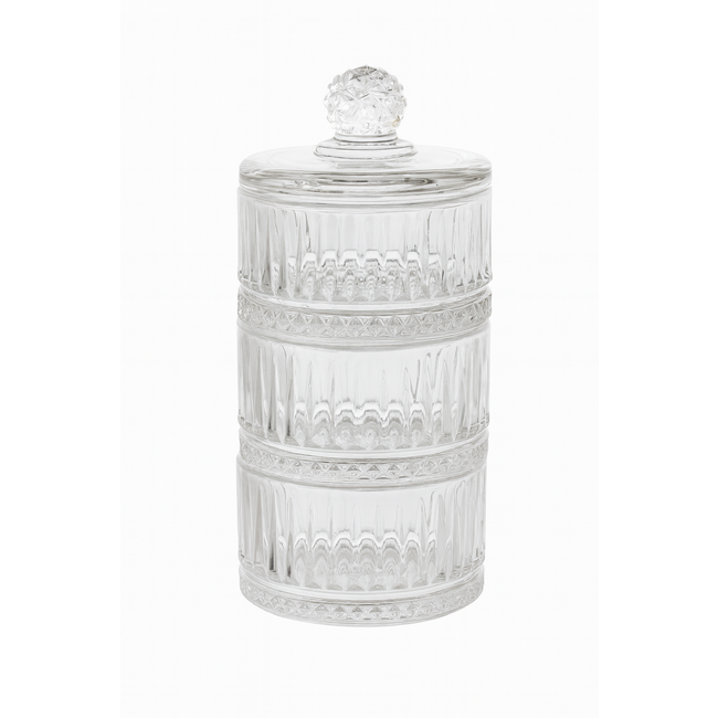 De Almina Elisa 3-laags glazen kom met deksel is een stijlvolle combinatie van luxe en praktisch design. Deze smalle variant is perfect voor het elegant presenteren of bewaren van patisserie, snoepjes, noten of kleine hapjes. De set is gemaakt van hoogwaardig geslepen glas met een verfijnde decoratieve knop, waardoor hij niet alleen functioneel is, maar ook een prachtig decorstuk vormt op tafel of in een vitrinekast.