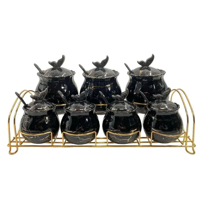 Voeg een moderne en luxe touch toe aan je keuken met deze porseleinen voorraadpotten set met marmerlook, verkrijgbaar in zwart/goud of wit/goud. Deze verfijnde set bestaat uit 6 voorraadpotten in verschillende formaten, stijlvol gepresenteerd in een stevige goudkleurige metalen standaard.Elke pot is gemaakt van hoogwaardig porselein en afgewerkt met een elegant marmerpatroon en glanzende gouden accenten op de deksels en randen. Perfect voor het stijlvol opbergen van suiker, koffie, thee, kruiden en andere droge ingrediënten.