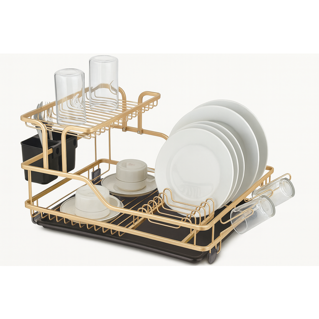 Geef je keuken een chique en moderne look met het Bavary afdruiprek in goud/koper. Het rek is vervaardigd uit duurzaam aluminium en voorzien van een stevige constructie die roestbestendig is. Het 2-laags ontwerp biedt voldoende ruimte voor borden, kopjes, kommen en glazen. Dankzij de geïntegreerde bestekhouder en glashouder blijft alles netjes geordend. De uitneembare lekbak vangt al het water op, zodat je aanrecht schoon en droog blijft. Ideaal voor iedereen die stijl wil combineren met praktisch gemak.