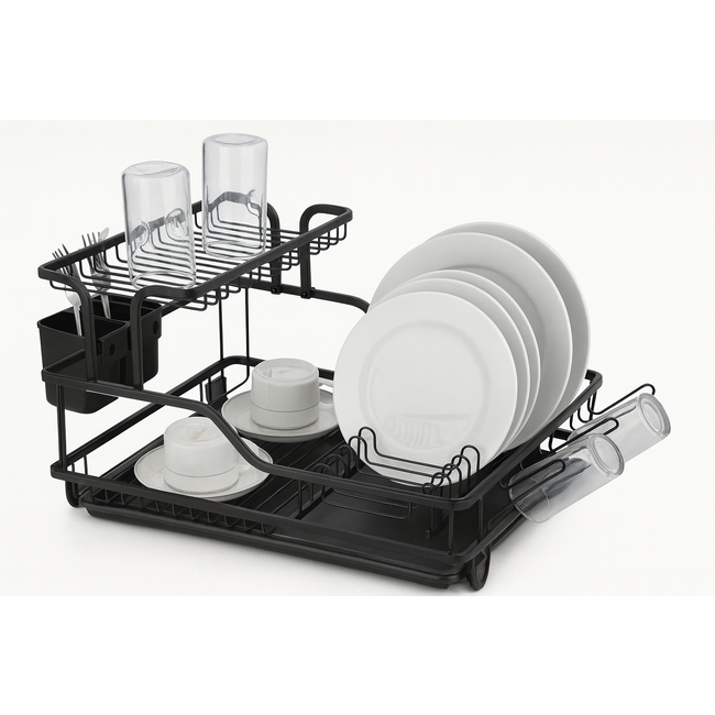 Het Bavary aluminium afdruiprek combineert duurzaamheid met elegantie. Het 2-laags ontwerp biedt volop ruimte voor borden, kopjes, glazen en kommen. Daarnaast is er een losse bestekhouder en een handige glashouder aanwezig, zodat alles netjes en overzichtelijk kan drogen. De stevige aluminium constructie in mat zwart geeft het afdruiprek een luxe en moderne uitstraling. Dankzij de uitneembare lekbak wordt overtollig water opgevangen en blijft je aanrecht altijd droog en schoon. Een stijlvolle en praktische toevoeging aan elke keuken.