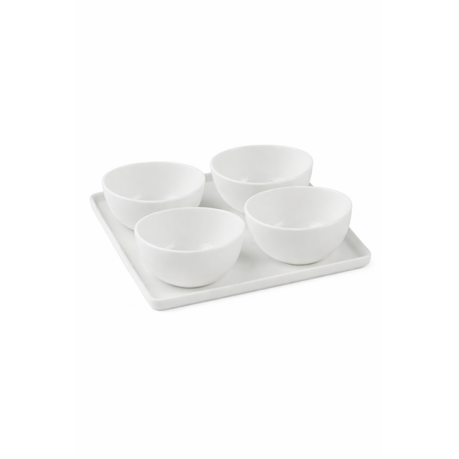De Smile Snack Bowl Set is een stijlvolle serveerset bestaande uit vier ronde keramische schaaltjes en een bijpassende tray. Het moderne design met zachte, afgeronde vormen zorgt voor een speelse maar luxe uitstraling op tafel.