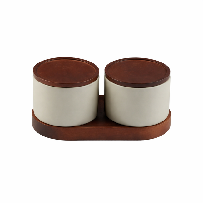 De Terra Voorraadpotjes Set is een elegante opbergoplossing bestaande uit twee keramische potjes met houten deksels, geplaatst op een bijpassende houten tray. De combinatie van crème keramiek en warm hout zorgt voor een moderne en natuurlijke uitstraling in iedere keuken.