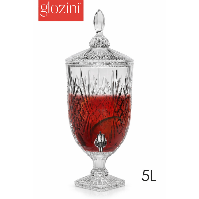 Deze 5 liter Glozini waterkan combineert functionaliteit met een luxe, klassieke uitstraling. De dispenser is vervaardigd uit helder glas met een verfijnd geslepen diamantpatroon dat zorgt voor een chique presentatie op tafel of buffet. Dankzij de praktische tapkraan schenk je eenvoudig water, limonade, ijsthee of andere koude dranken zonder te morsen. De bijpassende glazen deksel sluit de kan netjes af en de verhoogde voet biedt extra stabiliteit én voldoende ruimte om een glas onder de kraan te plaatsen. Met een lengte/hoogte van circa 50 cm is deze waterkan een echte blikvanger.