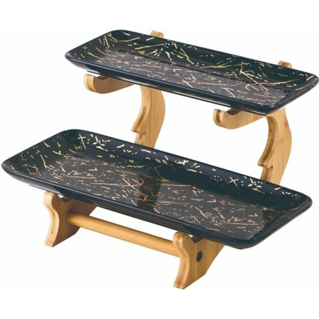 Presenteer je hapjes, desserts of fruit in stijl met deze 2-laags etagère van Hakal. De combinatie van diepzwarte serveerschalen met subtiele gouden accenten en een stevige houten standaard geeft deze etagère een luxe uitstraling. Ideaal voor feestjes, high tea, of als elegante blikvanger op tafel.