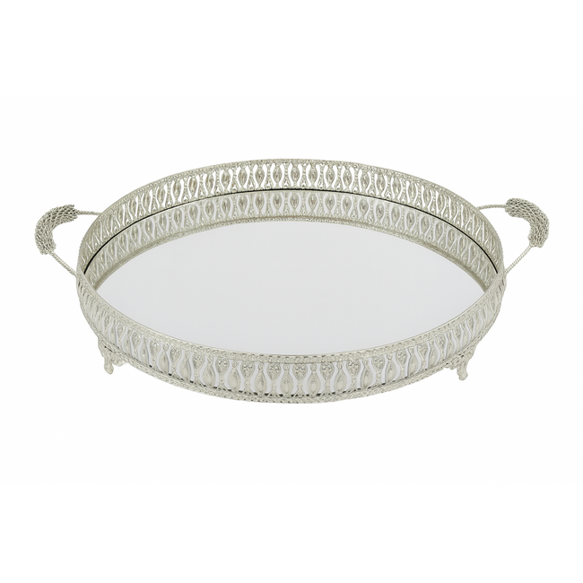 Dit ronde Hakal spiegel dienblad straalt luxe en elegantie uit. Met een mooi opengewerkte rand en een spiegelende bodem is dit dienblad perfect voor zowel serveren als decoreren. De stevige handgrepen maken het praktisch in gebruik, terwijl het stijlvolle ontwerp een echte blikvanger vormt op tafel, dressoir of in de koffiehoek.