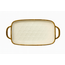 Deze stijlvolle rechthoekige porseleinen schaal met glanzende gouden handgrepen brengt elegantie en klasse op tafel. Het subtiele reliëfpatroon aan de binnenzijde geeft de schaal een moderne en luxueuze uitstraling. Perfect voor het serveren van hapjes, fruit, desserts of als decoratief item. Verkrijgbaar met gouden of zilveren accenten.