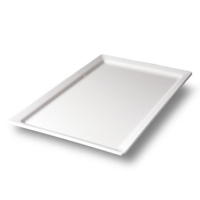 Groot rechthoekig catering plateau van melamine. Perfect voor het presenteren van buffetten, hapjes en desserts. Lichtgewicht, duurzaam en eenvoudig te reinigen. Geschikt voor horeca en thuisgebruik.
