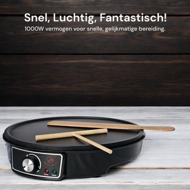Met een krachtige 1000W motor en een royale 30 cm anti-aanbakplaat bereid je snel en gelijkmatig perfect gebakken crêpes, pannenkoeken, eieren of omeletten. De verstelbare temperatuurregeling biedt maximale controle over je bakproces. Of je nu kiest voor flinterdunne Franse crêpes of luchtige Amerikaanse pancakes – met dit apparaat krijg je altijd een professioneel resultaat. Dankzij de meegeleverde houten hark en spatel werk je net als een echte crêpemeester, terwijl de slimme snoeropslag je keuken netjes houdt. Geniet dagelijks van perfect gebakken pannenkoeken, eieren en meer met de Royal Swiss Crêpemaker – een favoriet voor het hele gezin!