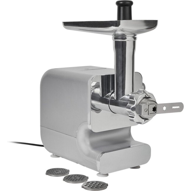Perfect voor thuisgebruik, meal prepping of creatieve vleesrecepten. Deze robuuste vleesmolen wordt geleverd met drie roestvrijstalen schijven (Ø 3 mm, 5 mm en 7 mm) waarmee je de structuur van je gehakt zelf bepaalt. Gebruik de meegeleverde worstenvuller om eenvoudig zelf verse worsten te maken. De omgekeerde functie voorkomt verstoppingen en maakt de molen extra gebruiksvriendelijk. Dankzij het roestvrijstalen mes en de kunststof schuifregelaar is dit apparaat ook hygiënisch en makkelijk schoon te maken.