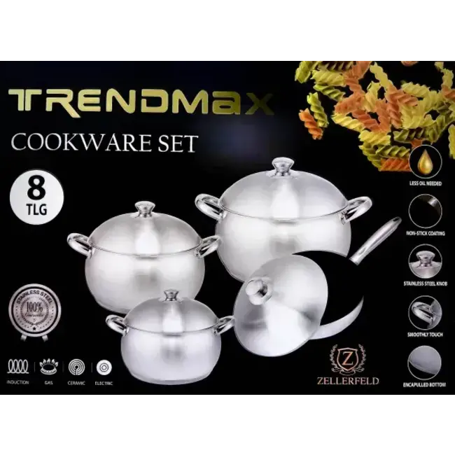 De TRENDMAX pannenset staat voor Zellerfeld's toewijding aan kwaliteit en is een betrouwbare partner in elke keuken. Geniet van het gemak, de efficiëntie en de elegante uitstraling van deze complete 8-delige pannenset.